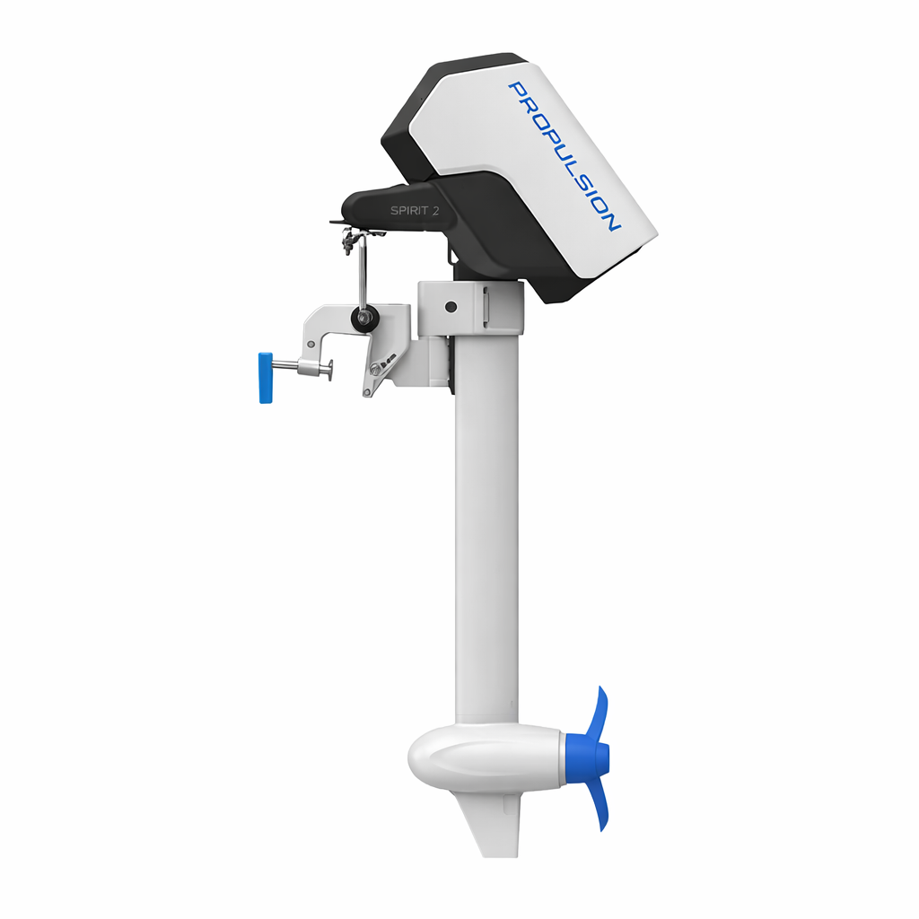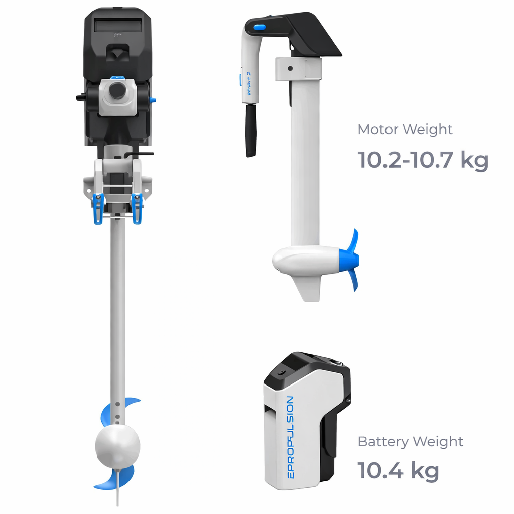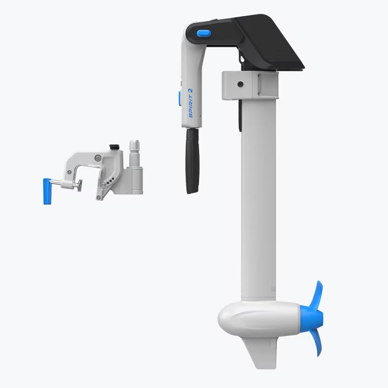 - Spirit 2, ein leistungsstarker elektrischer Außenbordmotor mit integriertem Akku. Dieses verbesserte Modell bietet mehr Leistung bei gleichbleibend kompakter Größe.