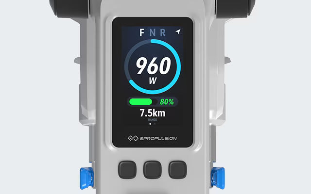 - Der 2 kW elektrische Außenbordmotor mit integrierter Batterie verfügt über einen 3 kW Sportmodus für verbesserte Leistung.