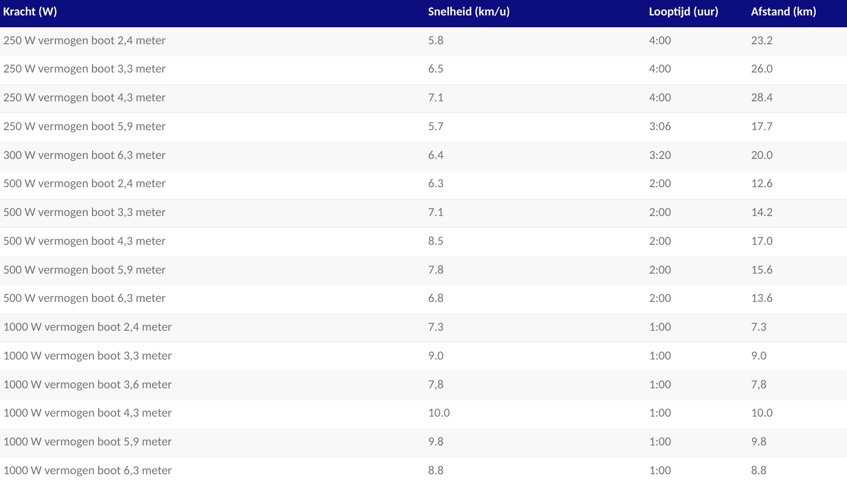 Assuming a consumption of 330 watts per hour (Wh), you'll get 4.5 hours of sailing. At 6 kilometers per hour, the range will be 27 kilometers. Sufficient for most water sports enthusiasts. - With the S430 electric sloop 4 meters with steering you can achieve a sailing speed at 100 Watt 5 kilometers per hour (range 65 kilometers), 250 Watt 6 kilometers per hour (range more than 30 kilometers), 500 Watt 7 kilometers per hour (range 18 kilometers), 1,000 (1 kW) Watt 8 kilometers per hour (range 10 kilometers).