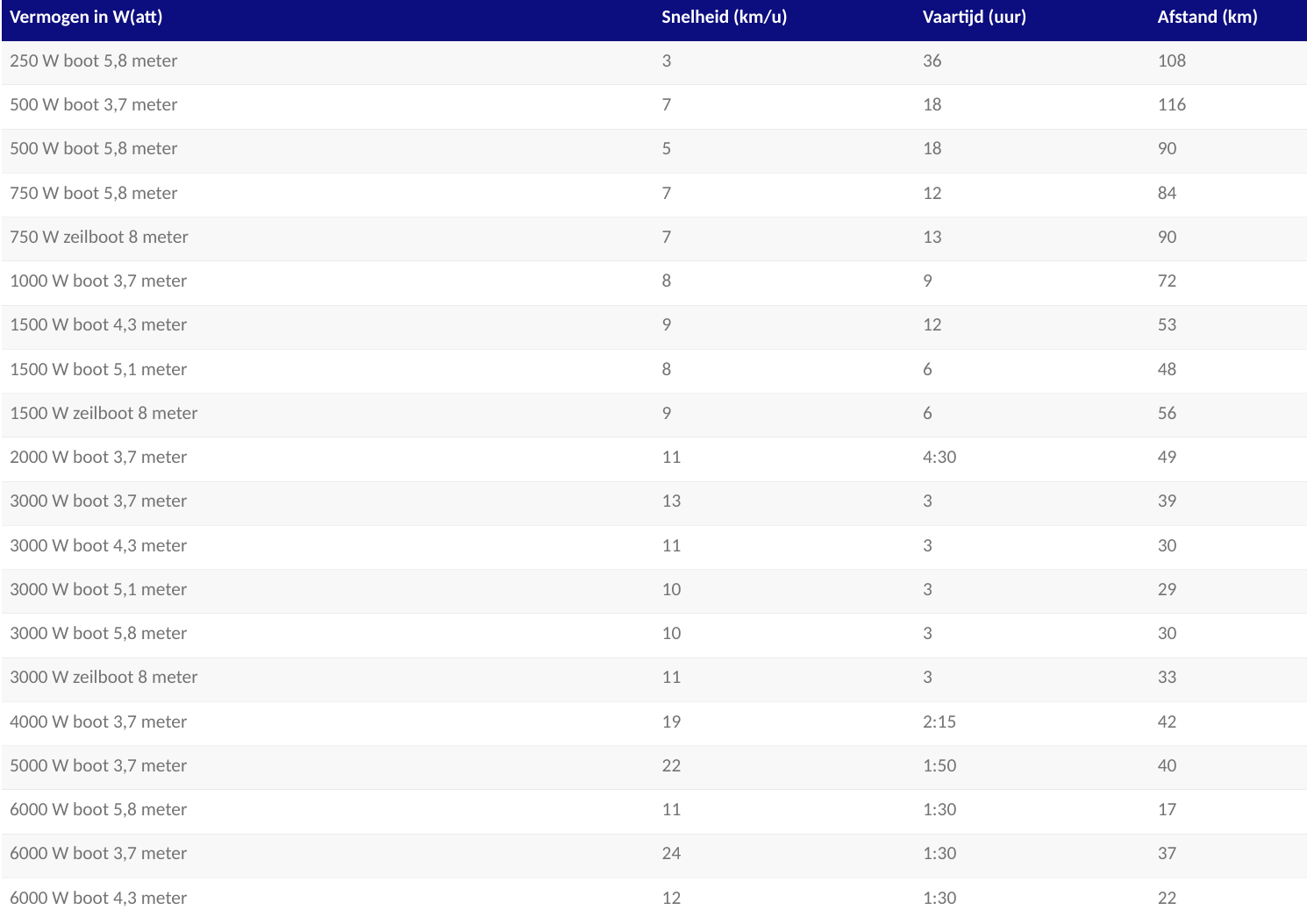 - Exclusief: Accu: minimaal 125Ah. Ga uit bij een verbruik van 2 kWh en een 9 kWh accu uit van 4,5 uur varen. Bij 7 kilometer per uur is het bereik dan 32 kilometer. Toereikend voor de meeste watersporters.