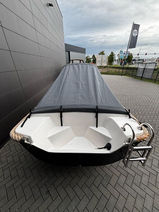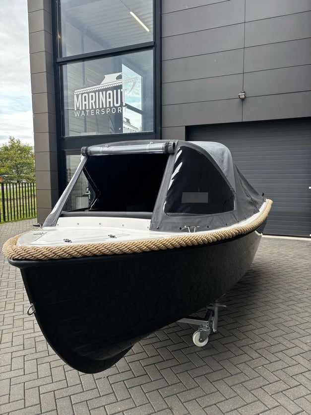 Buiskap met ramen (zit heerlijk uit de zon, regen en/of wind) met aangeritst kuipzeil (bescherm je sloep tegen vuil en vocht). Nederlands fabrikaat buiskap met en RVS (roestvast staal) frame.